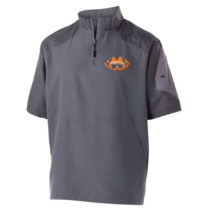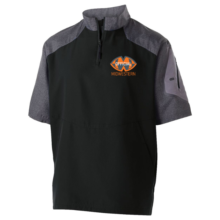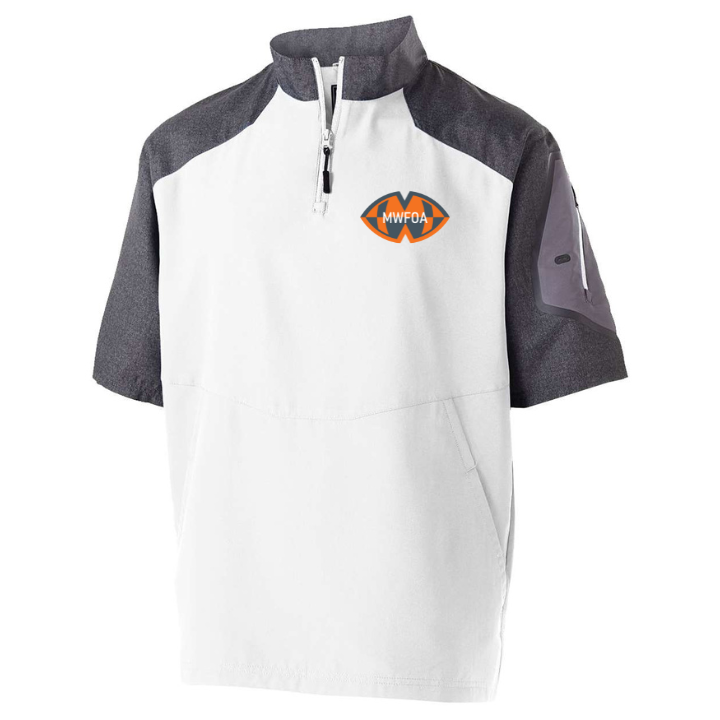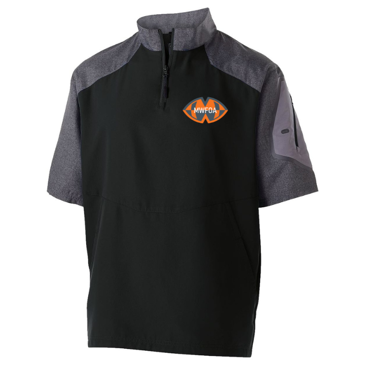 The Holloway Raider Short Sleeve Pullover is perfect for teams and coaches looking for lightweight weather protection without the bulk. Made from ultra-lightweight Aero-Tec™ fabric, this pullover ensures zero noise and optimal mobility. It features a tech print pattern on the neck and sleeves, a quarter zip style, and a sleeve pocket with a media port. The divided front pouch pocket and open bottom enhance functionality and comfort. This pullover is perfect for practices and games, providing a unified team look and protection from the elements.